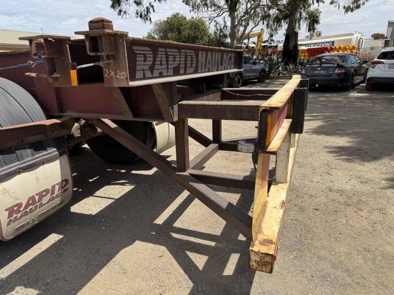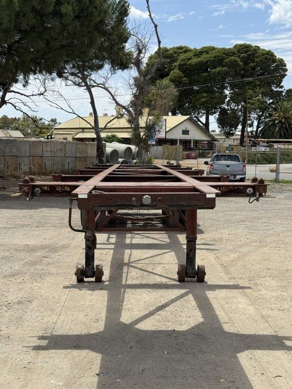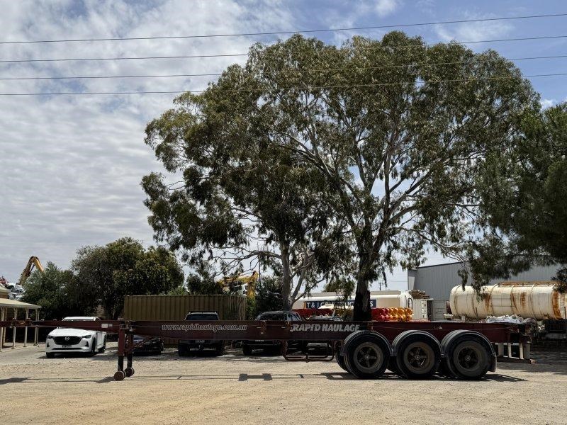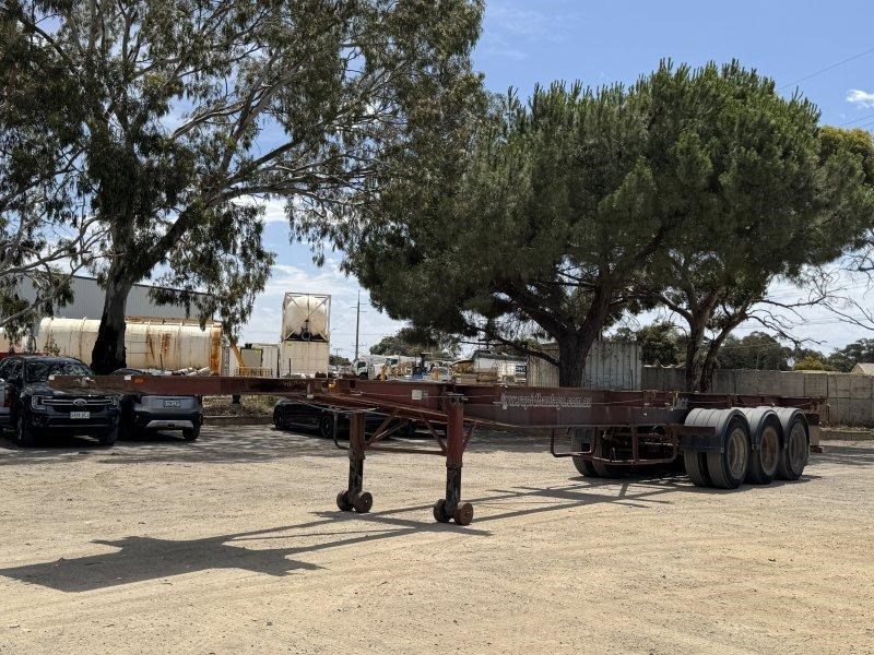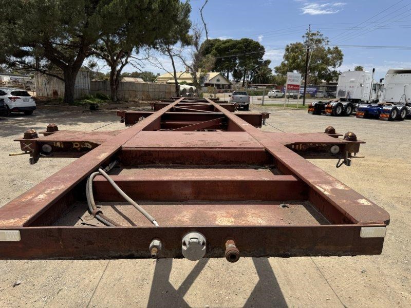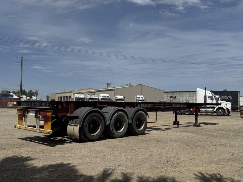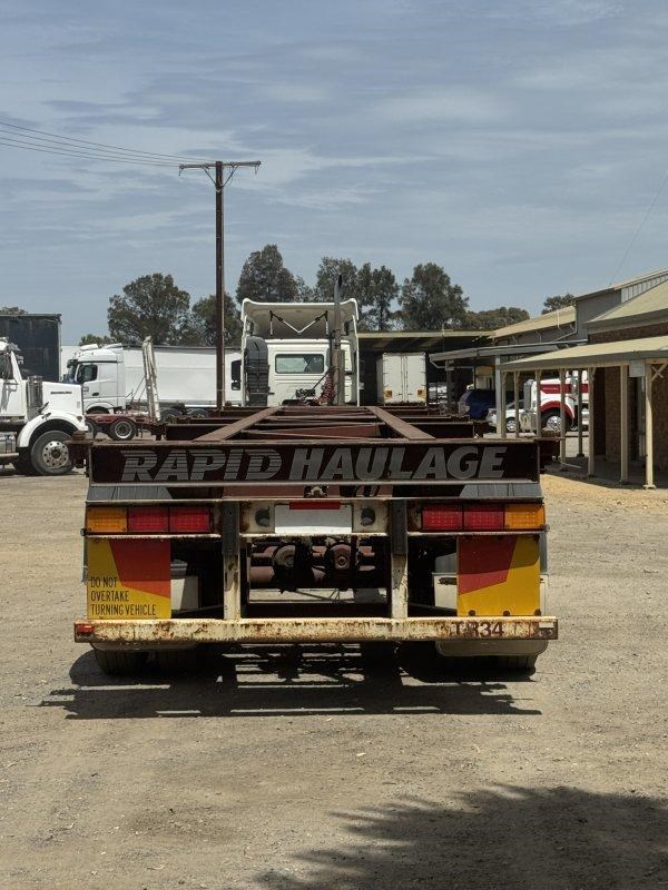 1996 Freighter Triaxle Skel, Spring Suspension, Spider Hubs, Push Out Rear Bumper, Dual Spare Wheel Carrier, 4 Way Twistlocks to Suit 1 x 20ft, 2 x 20ft, 1 x 40ft to suit two positions, Black Radius Guards, Landing Legs