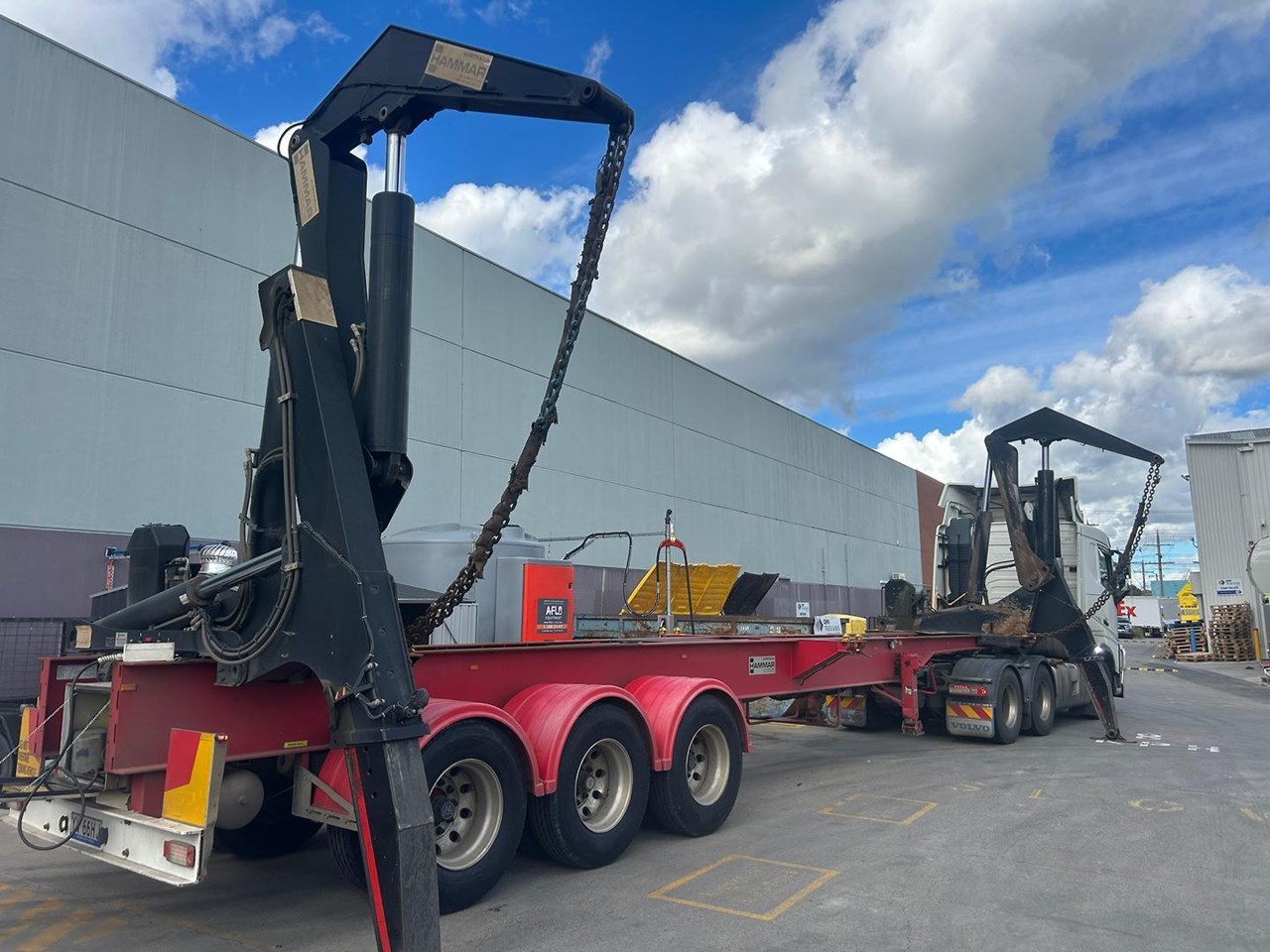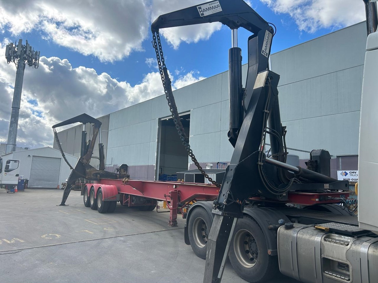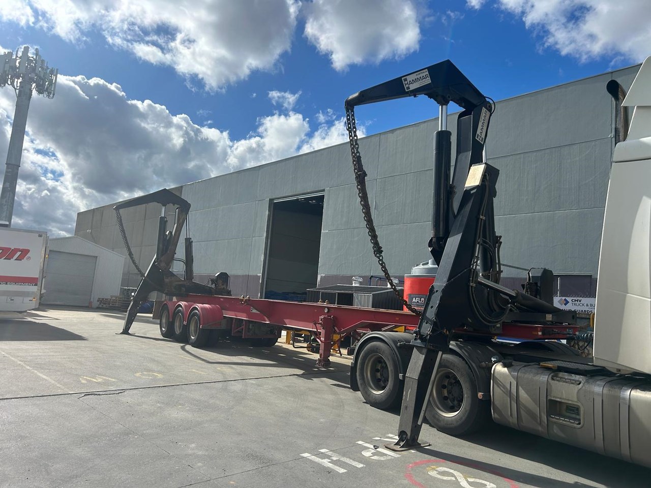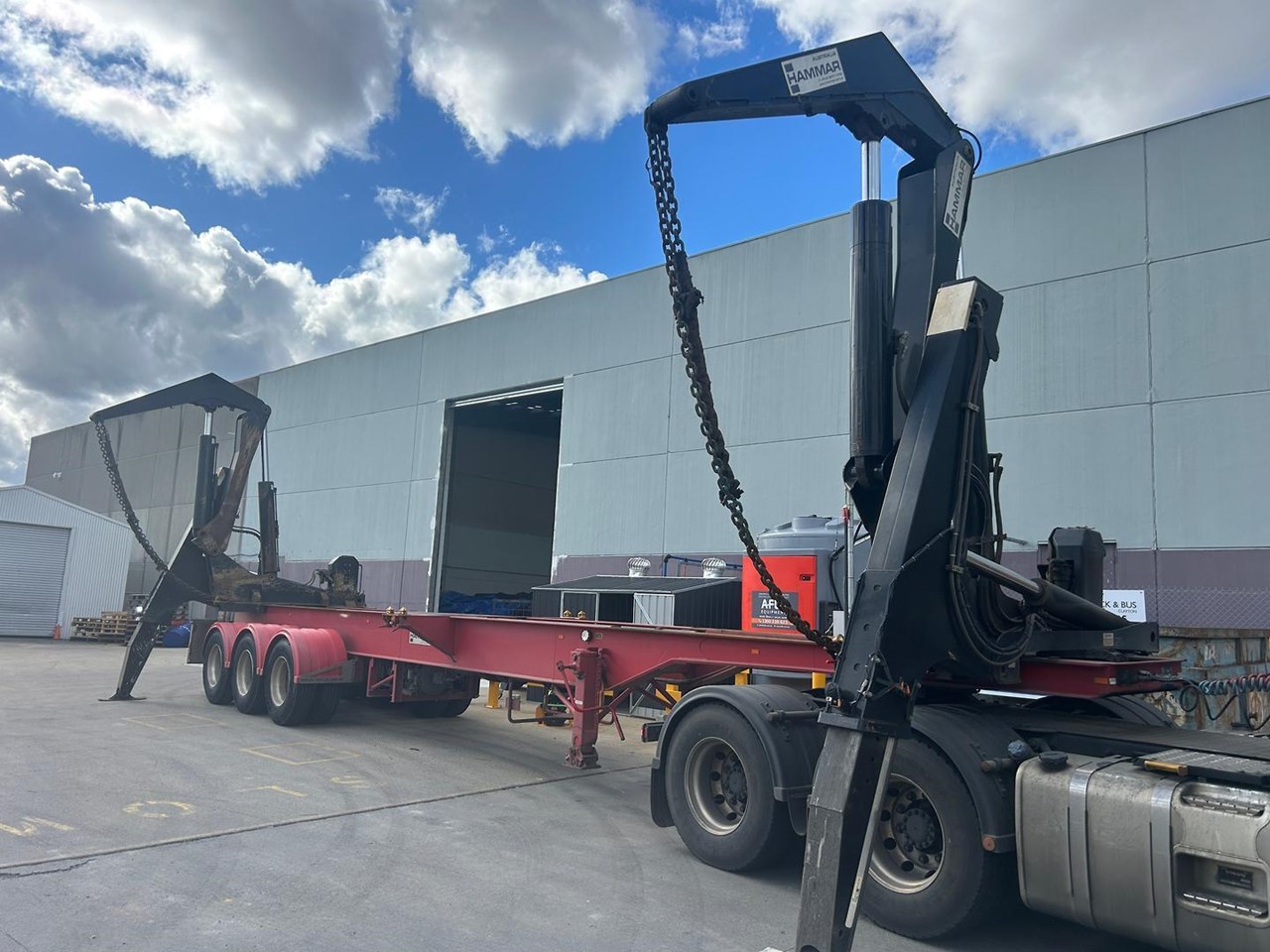 919 HRS 2019 Fixed Chassis, Sliding Cranes - 195 S HAMMER TRIAXLE SIDE LOADER, The S-chassis is a fixed length, and has sliding cranes meaning it can handle multiple container sizes. It has a straight forward design and the lowest tare weight of all Hammar chassis. Low hrs, new tyres clean hardly used triaxle adjustable side loader