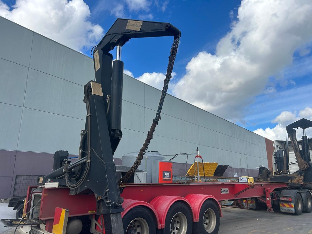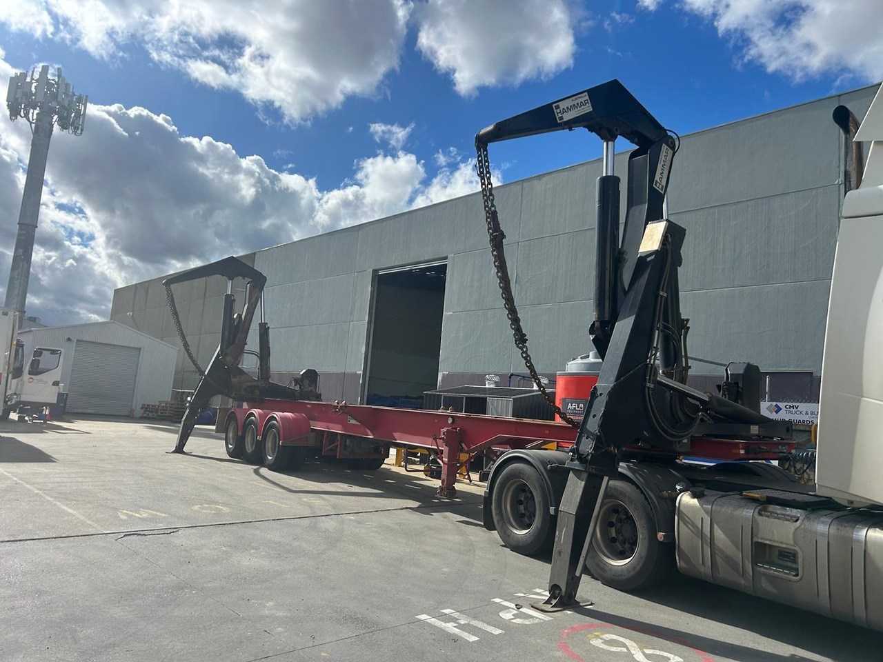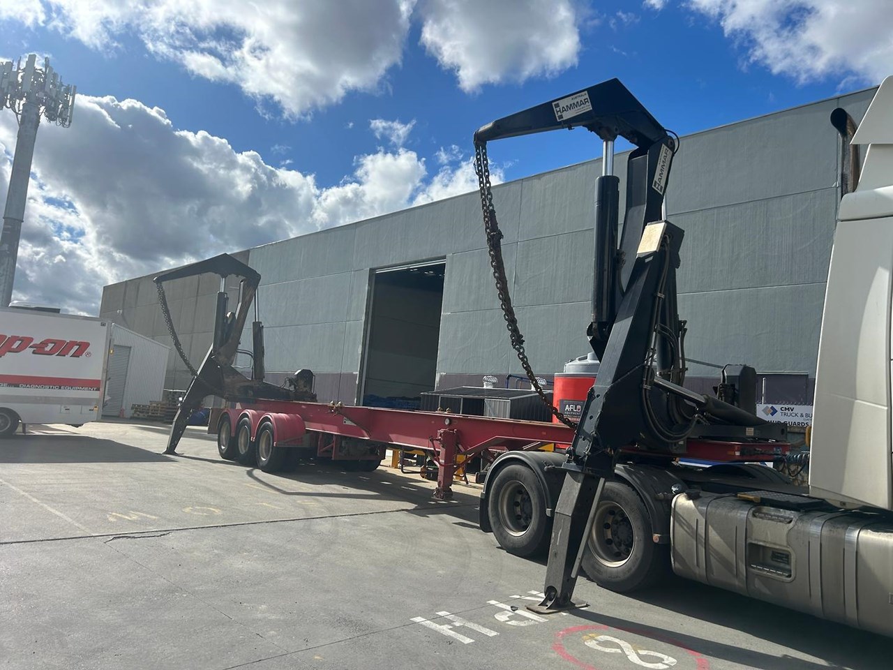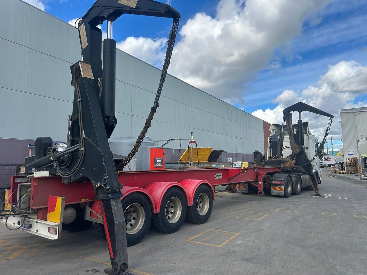 919 HRS 2019 Fixed Chassis, Sliding Cranes - 195 S HAMMER TRIAXLE SIDE LOADER, The S-chassis is a fixed length, and has sliding cranes meaning it can handle multiple container sizes. It has a straight forward design and the lowest tare weight of all Hammar chassis. Low hrs, new tyres clean hardly used triaxle adjustable side loader