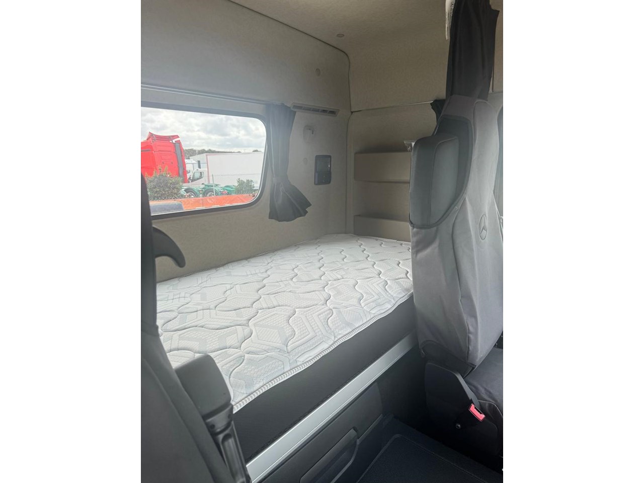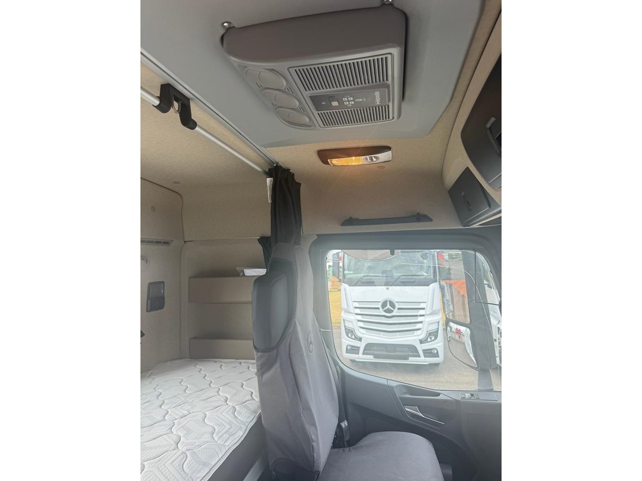 Cabin - Kerb mirror and main mirror, manoeuvring setting, co-driver's side - Driver and co-driver sunblind - Seat belt monitor - Air horns, cab roof - Air deflector, snap-in, with cab side deflectors - Sun visor exterior transparent with chrome highlight - TrendLine interior design with ambient lighting, chrome trim, carpet on engine tunnel - Leather steering wheel - Driver and co-driver air sprung comfort leather suspension seat - Luxury bed, bottom, inner spring - Luxury bed, top, wide, with levelling control - Multimedia Cockpit, interactive - Comfort telephony, wireless charging - Cruise control and speed limiter - Travel computer, on-board diagnosis and maintenance system - Truck navigation - DAB radio - Premium loudspeaker system with additional speakers - 24 V/15 A co-driver footwell sockets - Automatic climate control - Pull out tray table on passenger side - Stowage flap and compartments above windscreen - Stowage compartment exterior flap, left and right - Mercedes star, illuminated from behind in dark chrome - Dark chrome badging - Two 30 l pull-out refrigerators under bunk